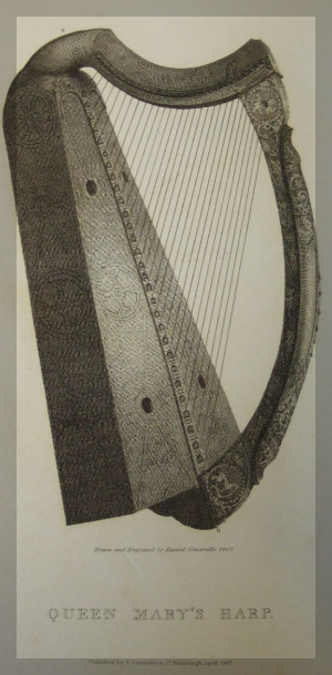 퀸 메리 하프 (Harp, Queen Mary’s Harp) – 15세기 스코틀랜드 에든버러(Edinburgh, Scotland)에서 제작된 초기 켈트 하프, 『켈트 민족의 하프에 대한 역사적 고찰(The Historical Inquiry into the Harp of the Celtic Races)』(1807) 판화 수록. 스코틀랜드 국립박물관(National Museum of Scotland) 제공 (Object No. H.1991.1)