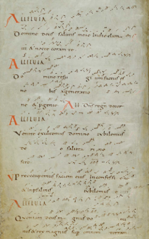 📑 이미지 출처: 선 없는 네우마 (Neumes, Cod. Sang. 359) – 10세기 초 스위스 장크트갈렌(St. Gallen, Switzerland)에서 필사된 성가 사본. 장크트갈렌 수도원 도서관(Stiftsbibliothek St. Gallen) 소장 (Manuscript: Cod. Sang. 359, Wikimedia Commons 제공)